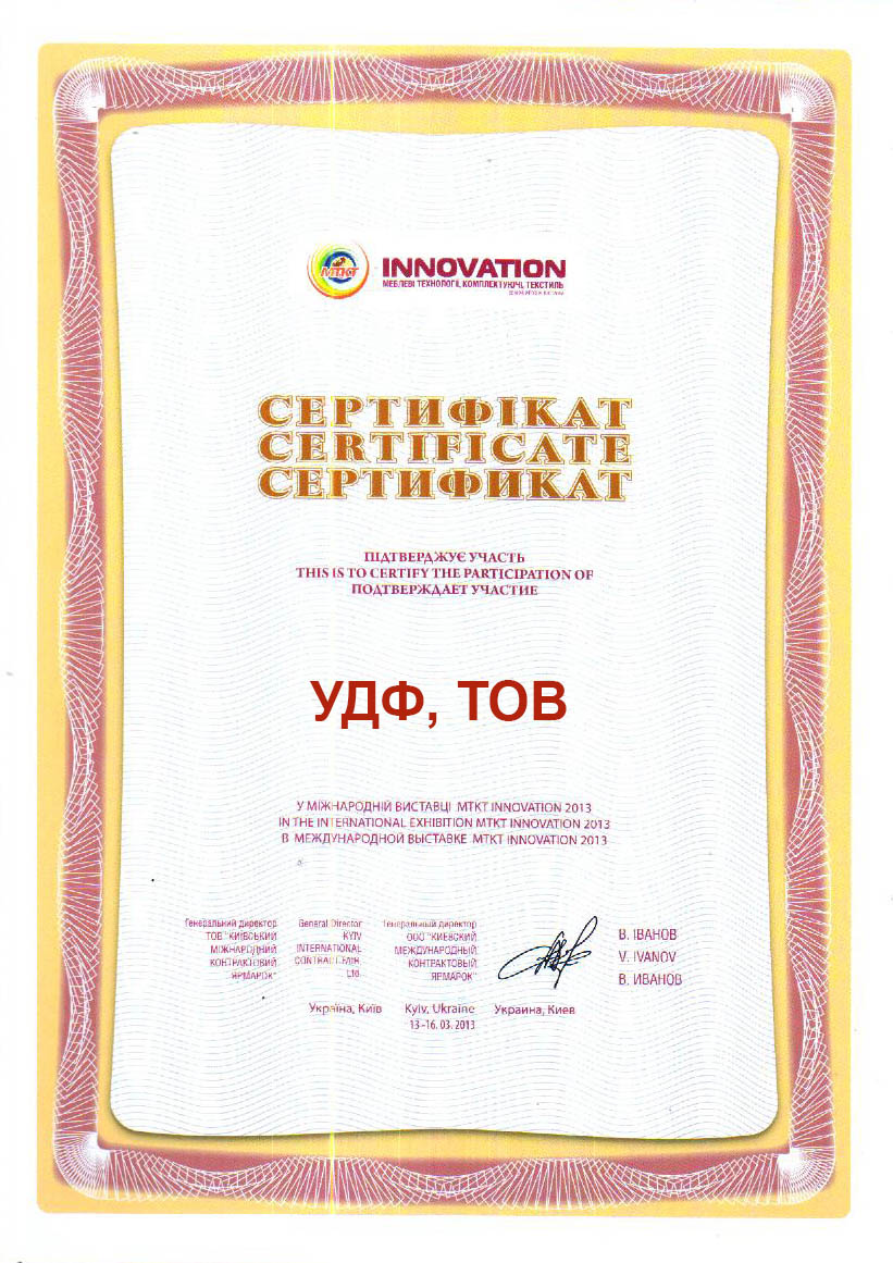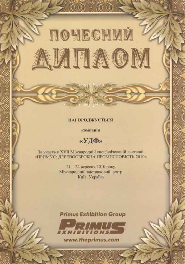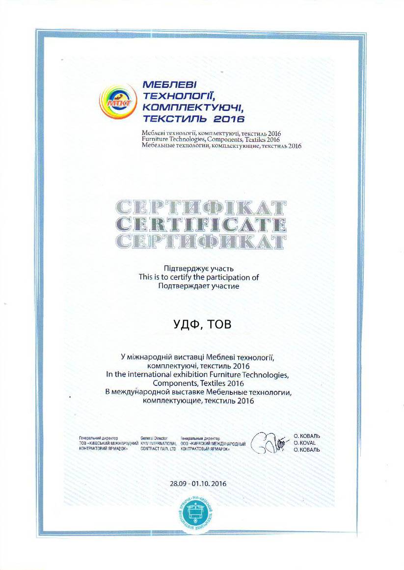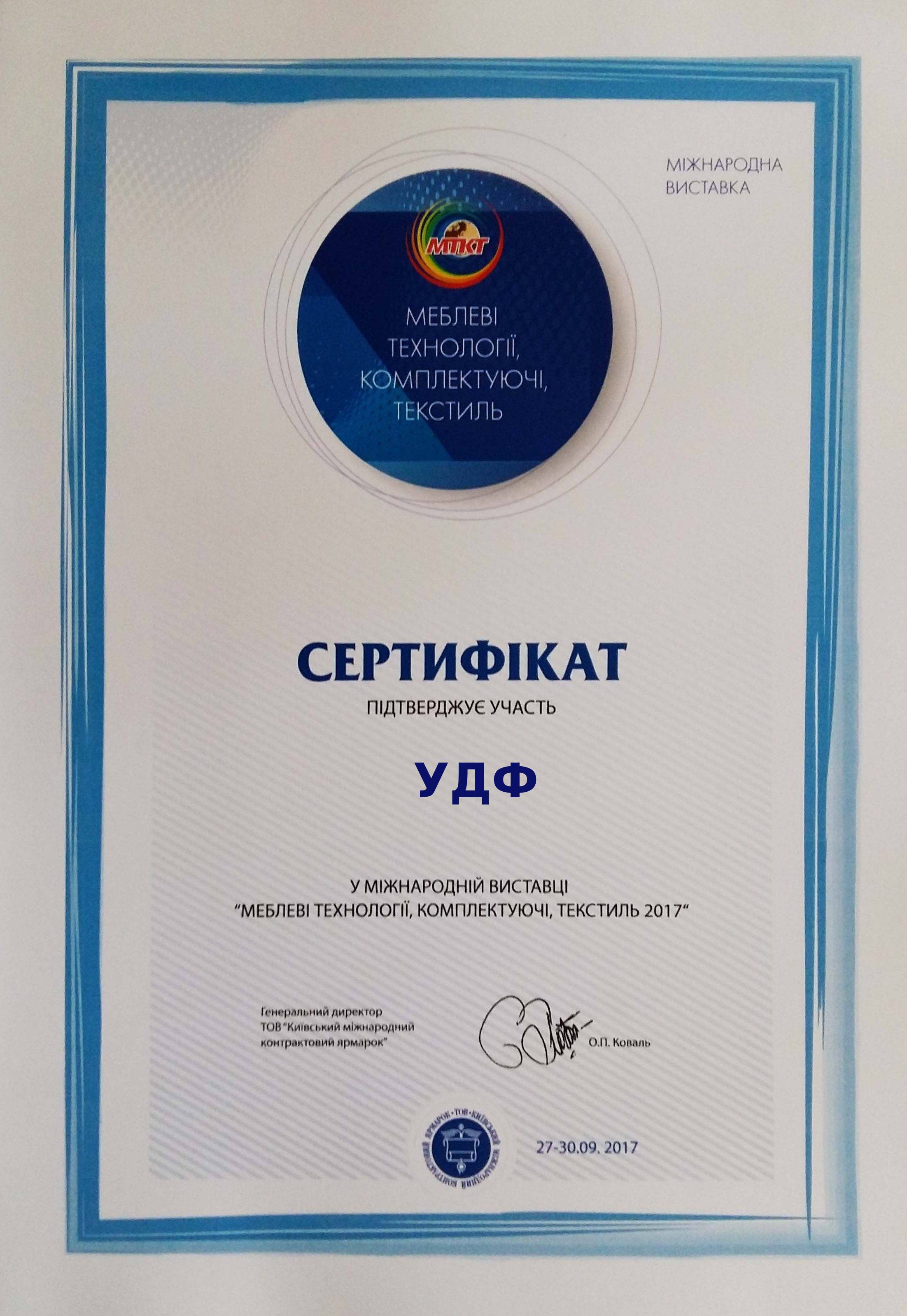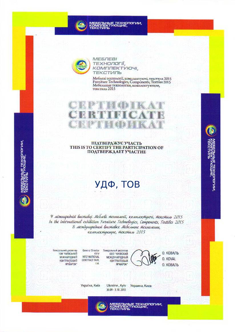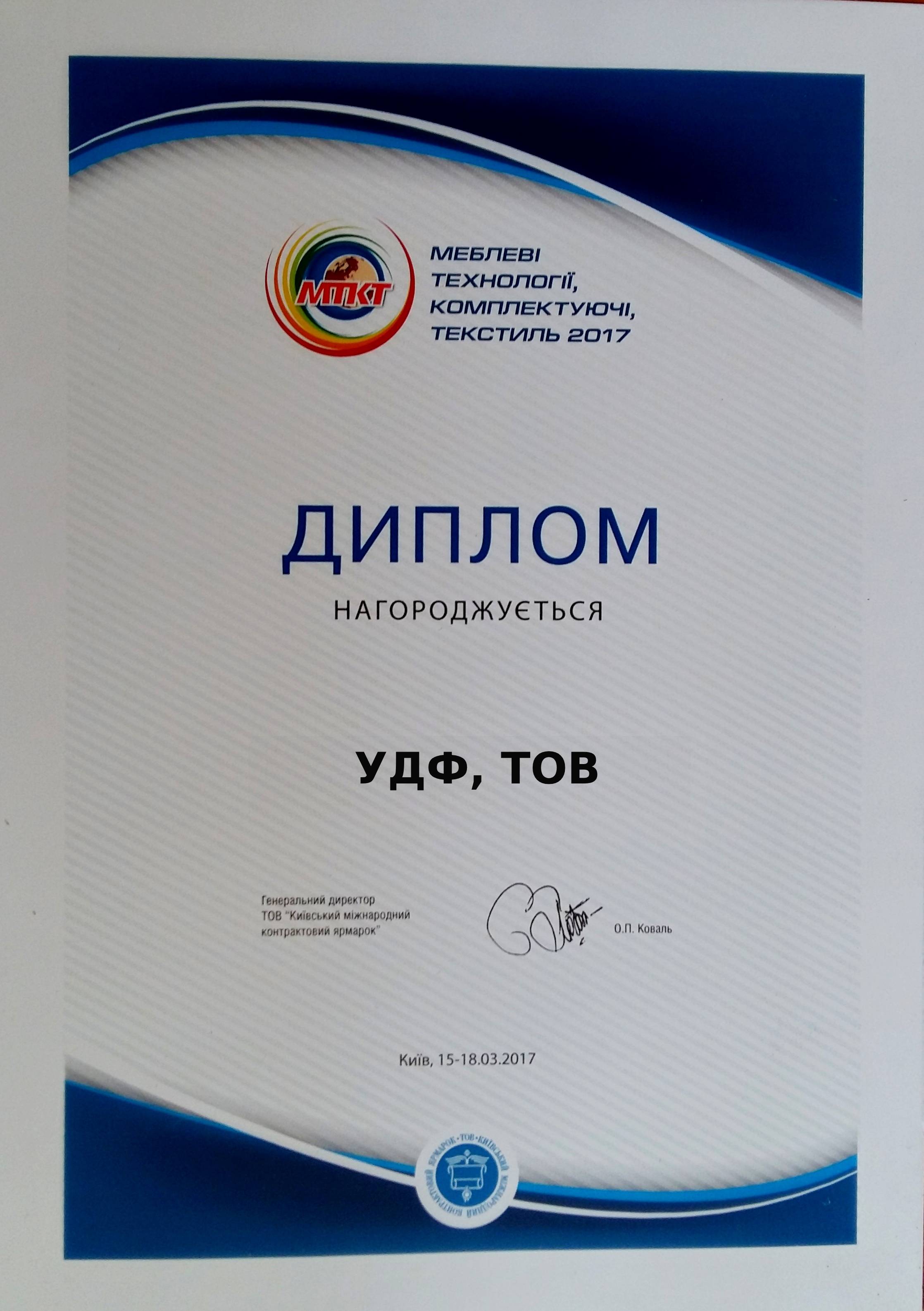 Sp. z oo UDF była wielokrotnie nagradzana za udział w wystawach z wysokiej jakości produktami fornirowanymi - dyplomami wystawienniczymi i certyfikatami za najlepszą jakość fornirowanej płyty MDF, płyty wiórowej, sklejki, płyty stolarskiej oraz zdublowanej krawędzi i forniru w rolkach.